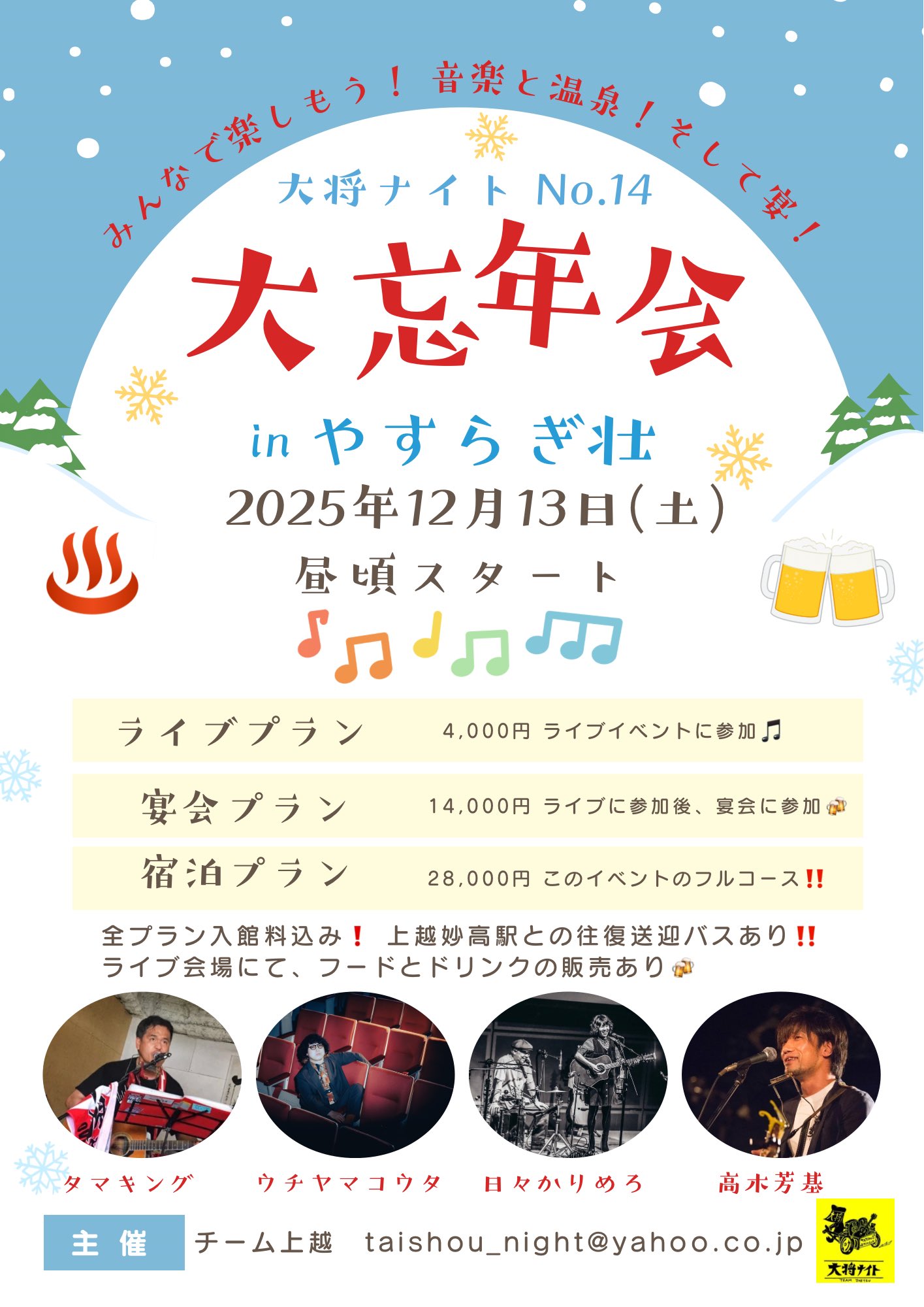 ライブのみプラン:4,000円 ライブと宴会プラン:14,000円 ライブと宴会と宿泊プラン:28,000円
