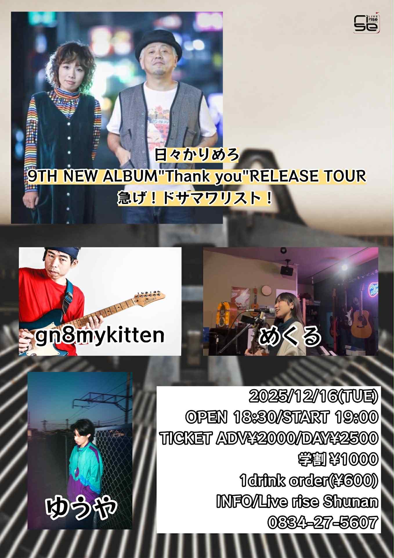 予約:¥2,000 当日:¥2,500+1ドリンク 学生¥1000